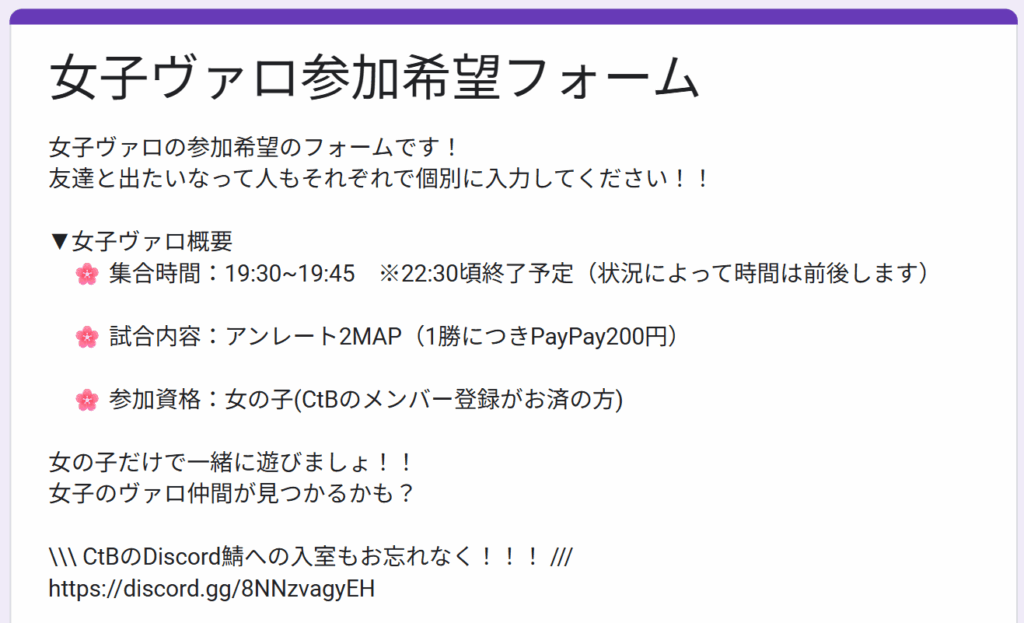 「なんとクリスマスに開催の女子ヴァロ!!正直に言いますと私はクリぼっち民だったので何か予定があることにとてもとても感激しております!!!!!!!!!!!なのでいつも以上に気合が入っております🔥今まで参加したことある人も参加したことない人も(ぽかりと同じくクリぼっちの人も…)参加お待ちしております!クリスマス楽しむぞおおおお!」